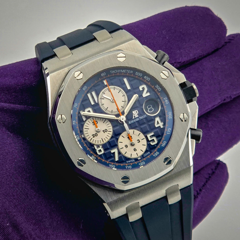 If you’re looking for a watch that can go with your blue jeans, blue tux, or blue Lamborghini, then you have found it. This is THE timepiece to consider for that very case. This specific Royal Oak Offshore is an absolute stunner with a beautiful stainless steel case and bezel with a refined brushed finish. The dial features the navy mega tapisserie pattern adorned with the contrasting white sub dials featuring a pop of orange on the hands. A head turner and conversation piece in all situations.