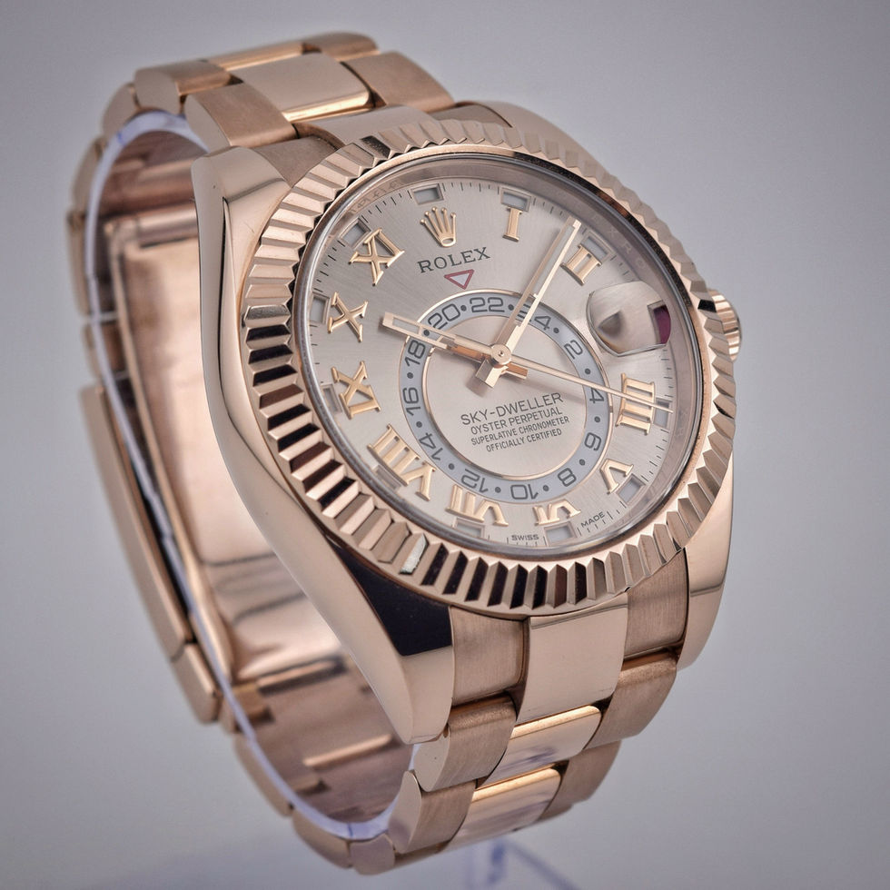The Rolex Sky Dweller is a timepiece that needs no introduction. Especially when complemented by a jaw dropping Rose Gold case and a hypnotizing (and discontinued) Sundust dial. The Sky Dweller is Rolex's most complicated watch. It can display time in a secondary time zone in addition to the local time, utilizes an annual calendar, and provides the current date.